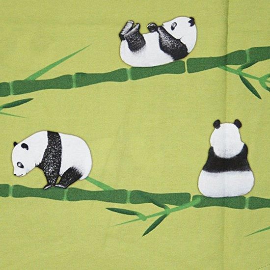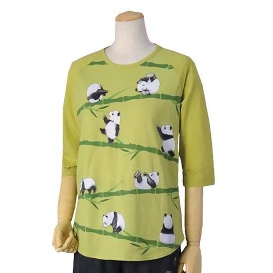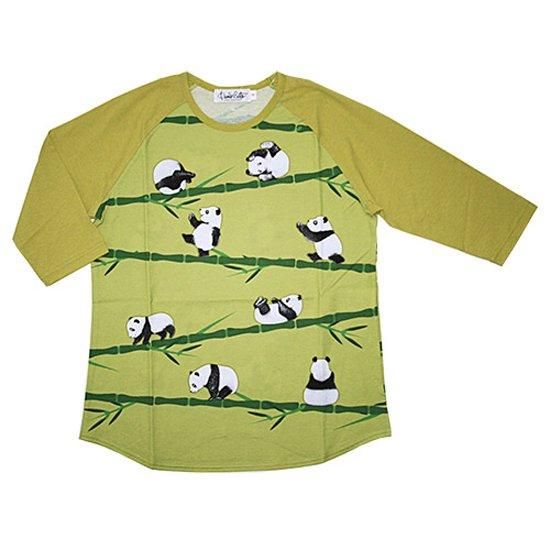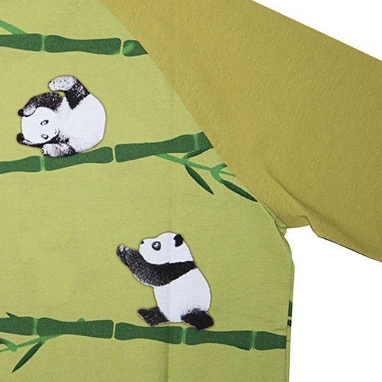 パンダと笹のプリントデザインが新鮮で可愛い天竺生地のラグランTシャツ。袖部分は無地です。日本製。